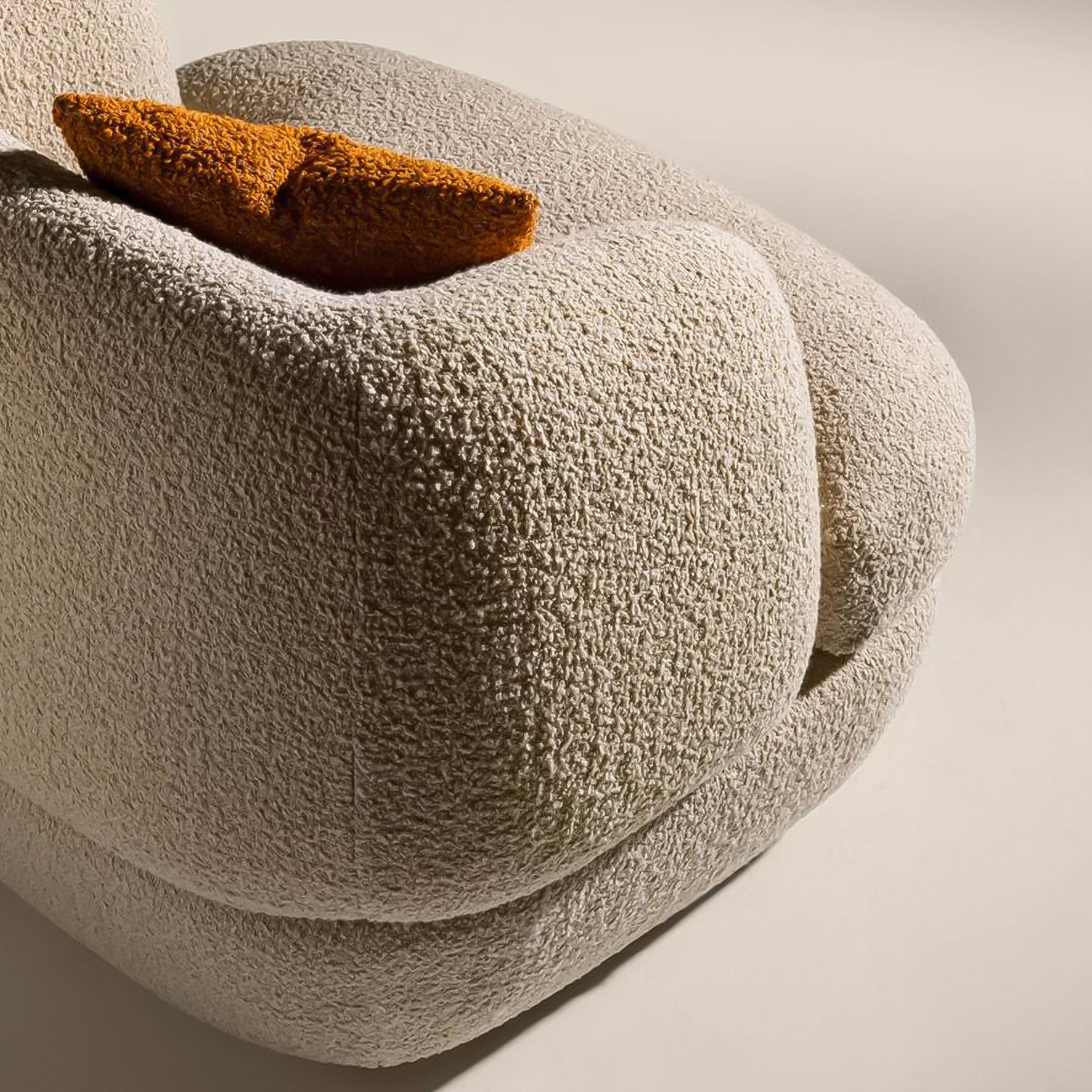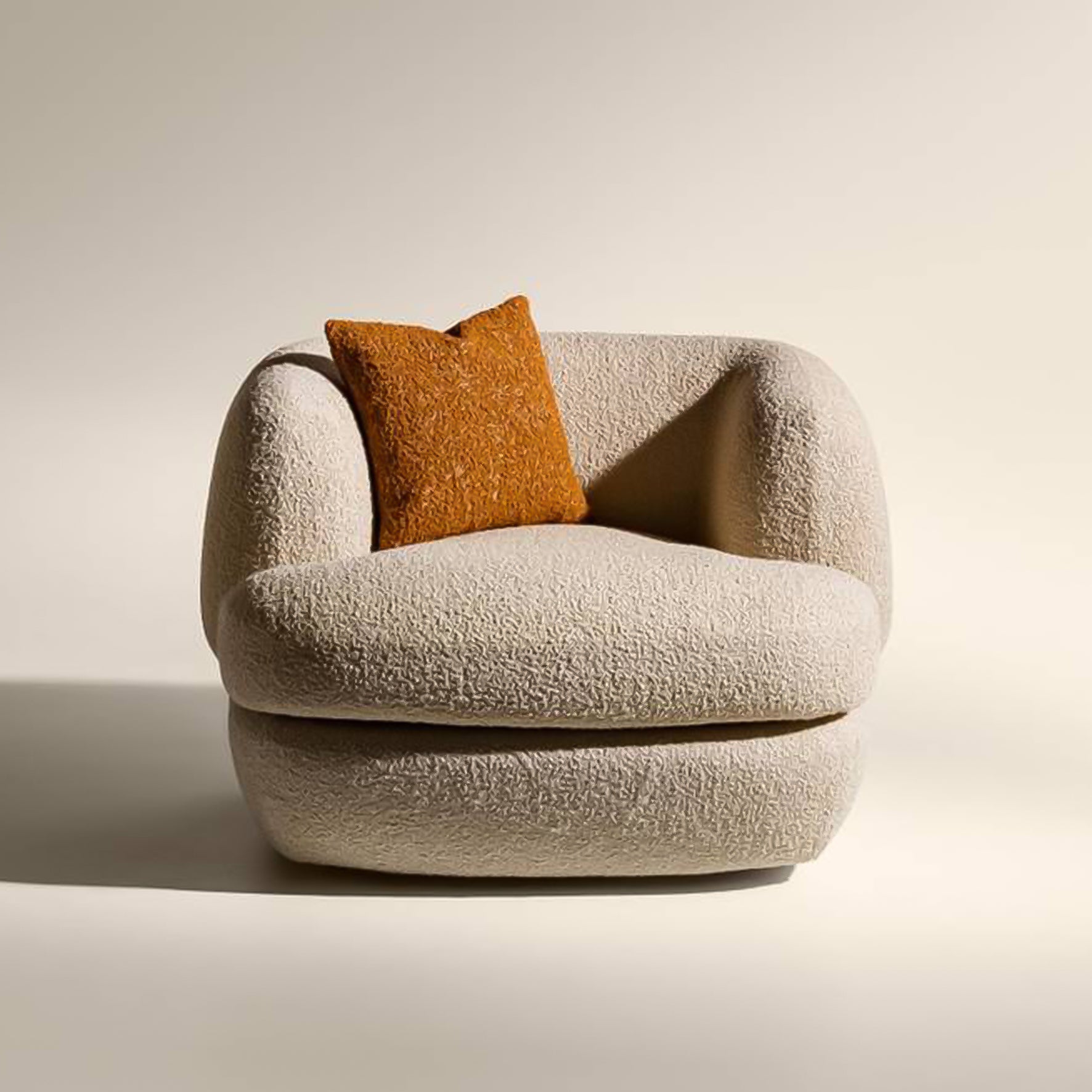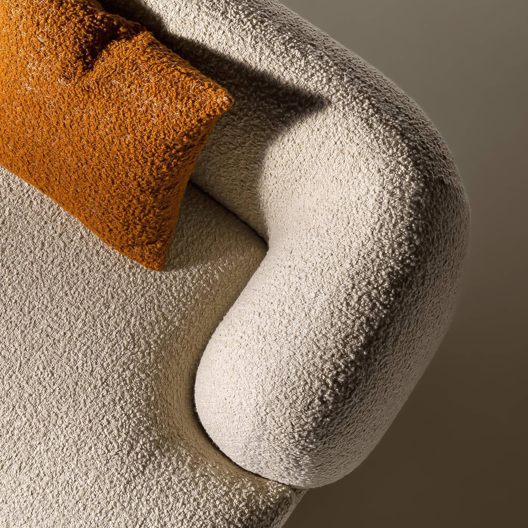 Sırt dayanağının konik tabandan taşarak öne çıkması ve hacimli yapının kıvrımlı, davetkâr formu, bu ürünü karakterize eden temel unsurlardır.