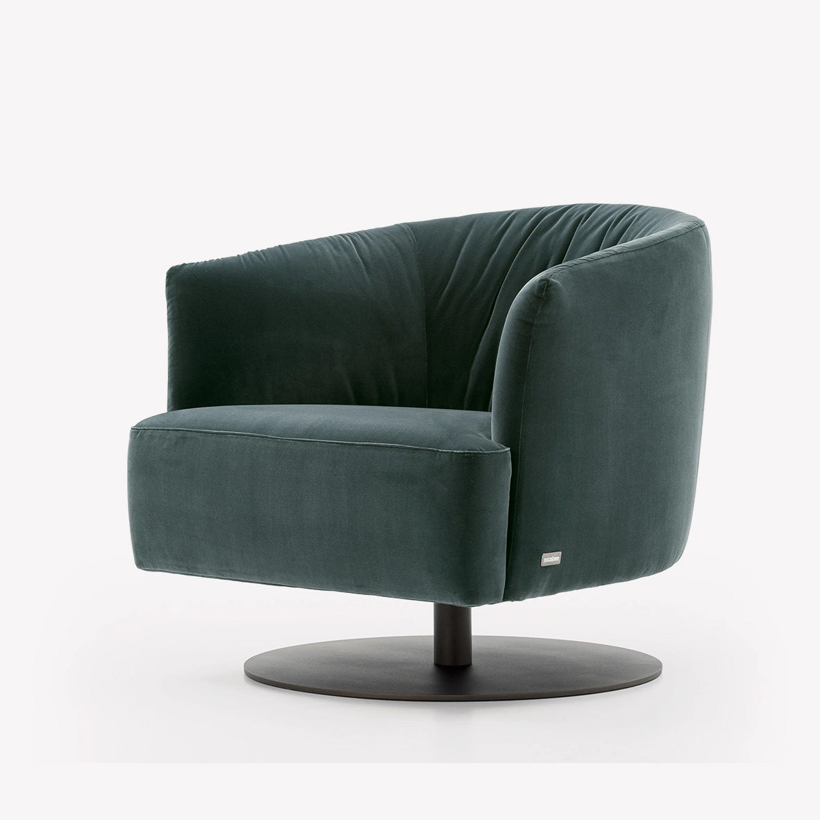 Koltuğun 360° dönmesini sağlayan dairesel taban, sırt dayanağının akıcı hattıyla dengelenerek konforlu ve zarif bir oturma alanı yaratır.