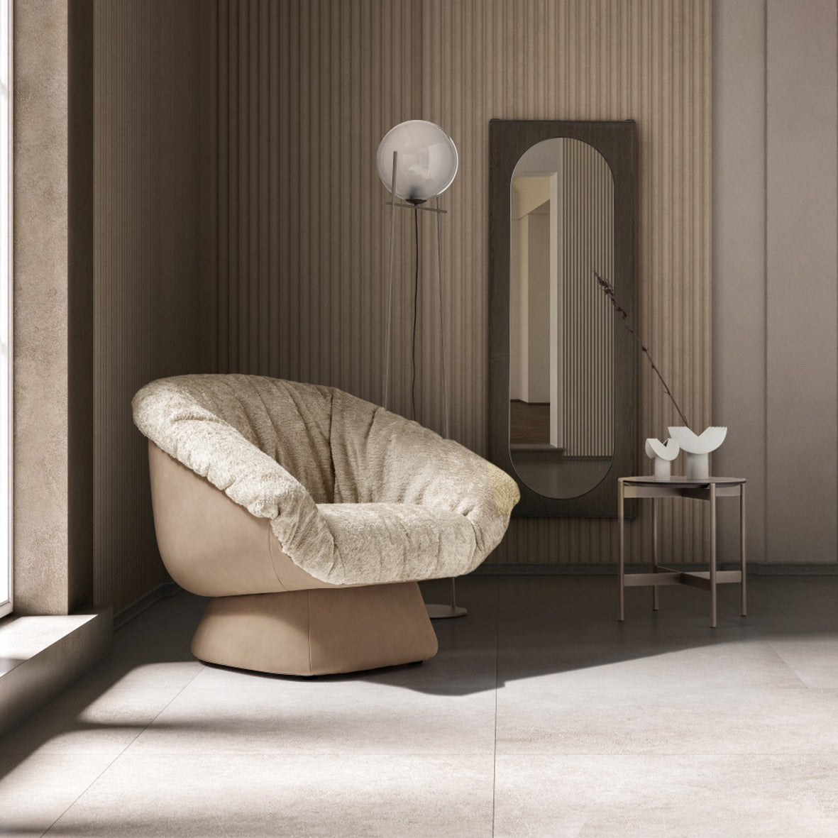 Hall, bir likör kadehinin oturma biçimine dönüştürülmesi fikriyle tasarlandı. Bu stilize yorum, hem oranlarında hem de formunda asil bir hava taşıyan bir sandalye ortaya çıkardı.