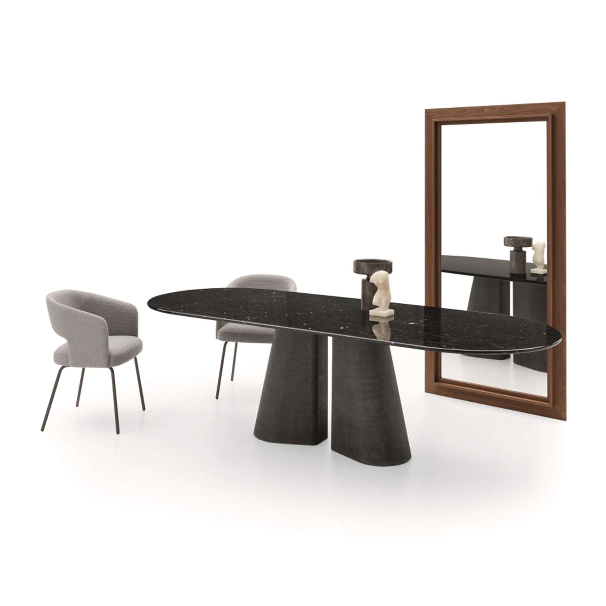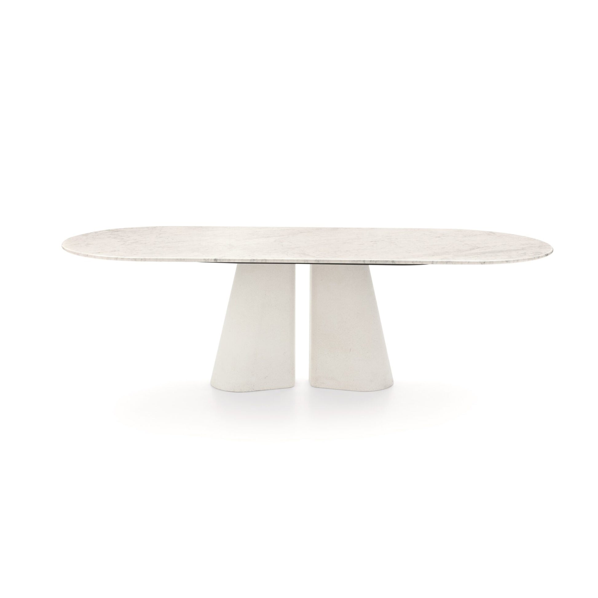 Minimalist bir üst yüzey, Yunan agoralarından ilham alan iki sütundan oluşan heykelsi bir kaidenin üzerinde durur. Kompozisyonun karmaşıklığı, çimento ve mermer gibi temel malzemelerle kaplanmasıyla ortaya çıkar. Bu masa, yemek alanını zarif bir şekilde döşer.