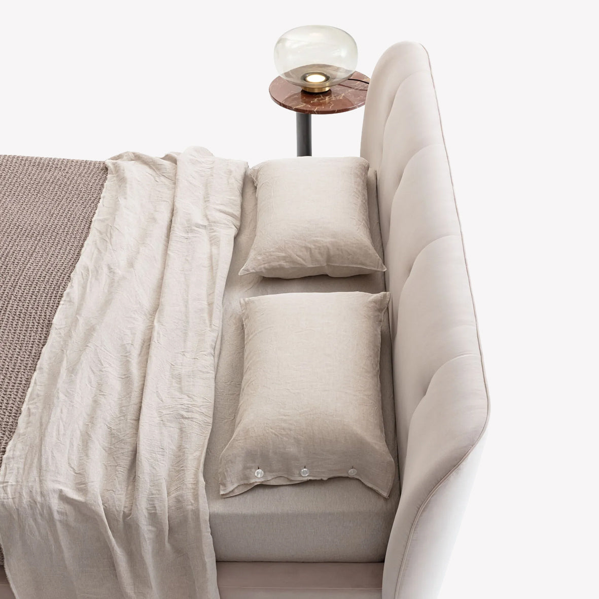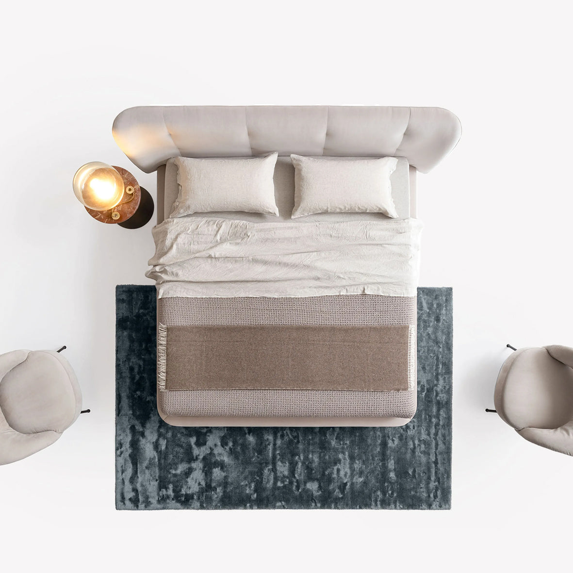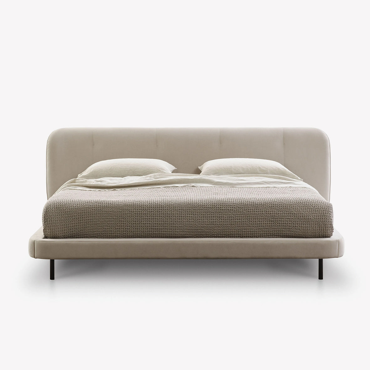Geniş hacimli yapısı ve ince ayakları, bu konforlu ve uyumlu formlara sahip yatağı doğal bir dengeyle taşır.